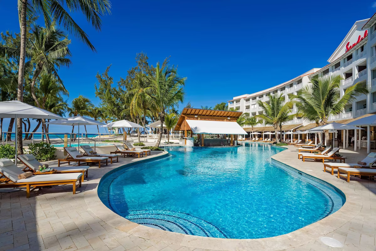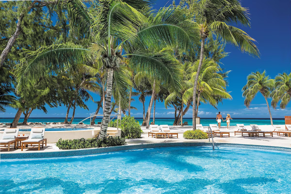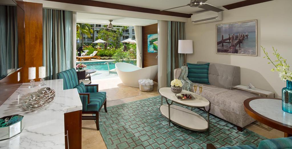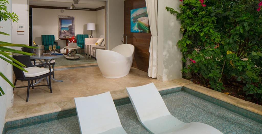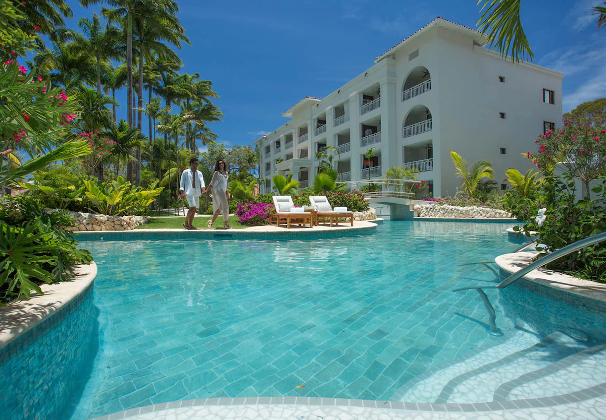Located on the ground floor of the Crystal Lagoon Village, these luxurious swim-up suites boast a large private patio with circular Tranquility Soaking Tub for two and zero-entry access to the resort’s Crystal Lagoon pool. A spacious interior features elegant furnishings, a four-poster, king-size bed, HD smart TV and a comfy sitting area with a fully stocked bar. The en-suite spa-style bathroom is outfitted with a double basin vanity, dual-control walk-in rain shower, and backlit mirrors. Guests enjoy Club Sandals concierge services including private check-in, all day in-room dining, and access to the Club Sandals Lounge.