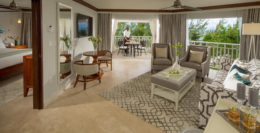 Located on the fourth floor of the Beachfront Village, these luxurious suites boast sweeping ocean views from a private balcony featuring a Tranquility Soaking Tub for two. A spacious interior features elegant furnishings, a four-poster, king-size bed, HD smart TV and a comfy sitting area with a fully stocked bar. The en-suite spa-style bathroom is outfitted with a double basin vanity, dual-control walk-in rain shower, and backlit mirrors. Guests enjoy Club Sandals concierge services including private check-in, all day in-room dining, and access to the Club Sandals Lounge.