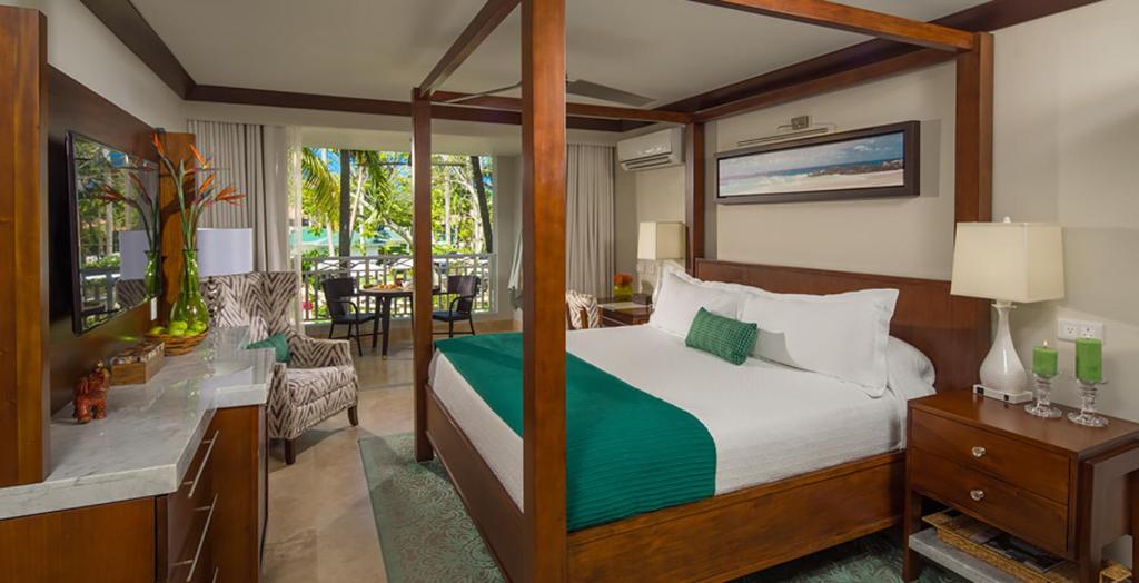 Located on the second floors for the Caribbean Village, these quaint rooms feature elegant furnishings, a four-poster, king-size bed, HD smart TV, and a private balcony showcasing serene views of the resort’s beautifully landscaped gardens. The en-suite bathroom is outfitted with a shower or bathtub with shower and penny glass tile detailing.